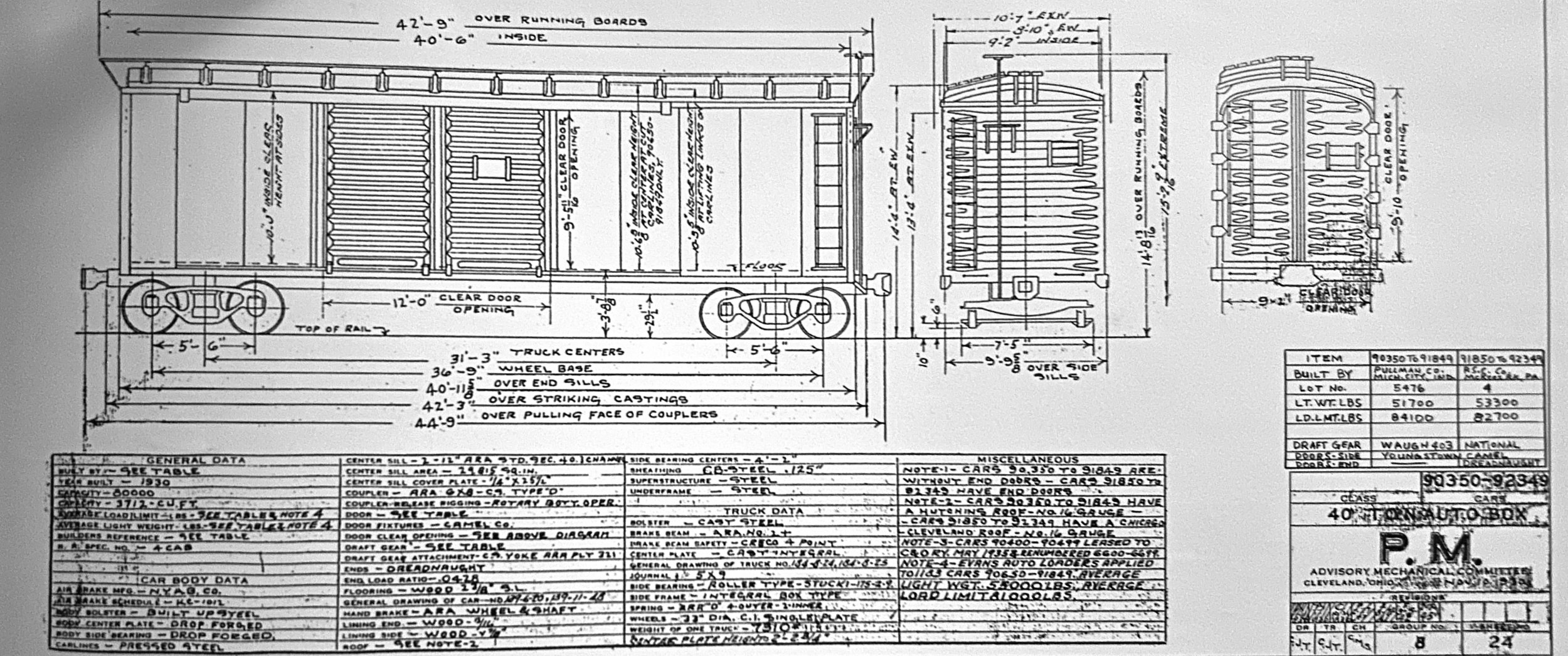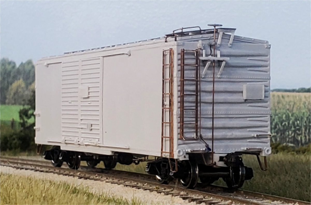 The Pullman built cars (the focus of this kit) were of all steel construction with unique three-piece “recessed” ends, Hutchins Dry Lading roofs, double Youngstown corrugated doors with Camel no. 50 fixtures covering a 12-foot door opening, K brakes, unpowered shaft hand brakes, bottom operated couplers, towing loops, and cast steel ARA style trucks. The cars came with a single bracket-type grab at the left edge of the car sides. The ladders were 8-rung side and 7-rung end, with the bottom rung on the end ladders being drop grab irons. As delivered, the cars were not equipped with auto loaders.