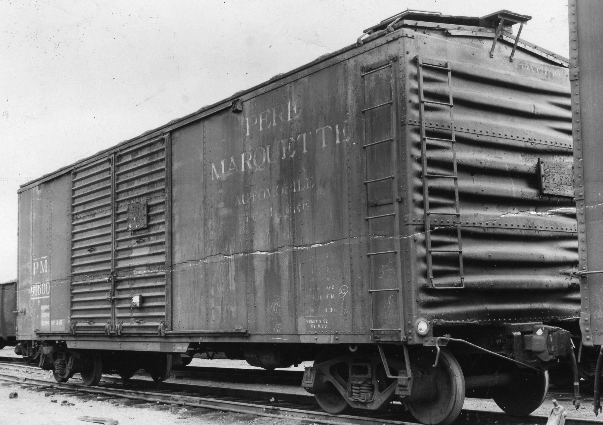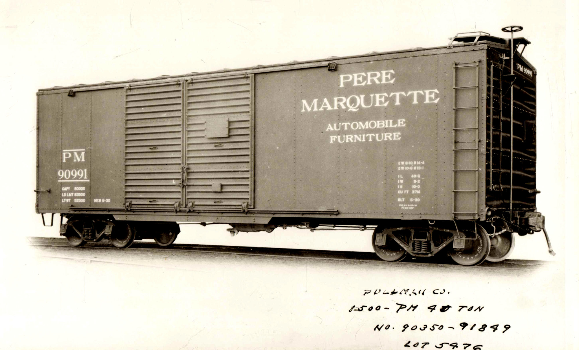 In 1930, the Pere Marquette ordered 1,500 Automobile/Furniture cars from Pullman Car Manufacturing Company and 500 from the Pressed Steel Car Company. The Pullman cars were numbered 90350-91849, while the Pressed Streel cars were numbered 91850-92349. These Pressed Steel cars differed from the Pullman cars in that they had an end door and a Chicago-Cleveland Climax radial roof. Outwardly, the cars were otherwise the same. The order was part of the railroad’s expansion of its rolling stock to take advantage of the exploding automobile industry and the need to move the newly manufactured autos to the dealers around the United States.